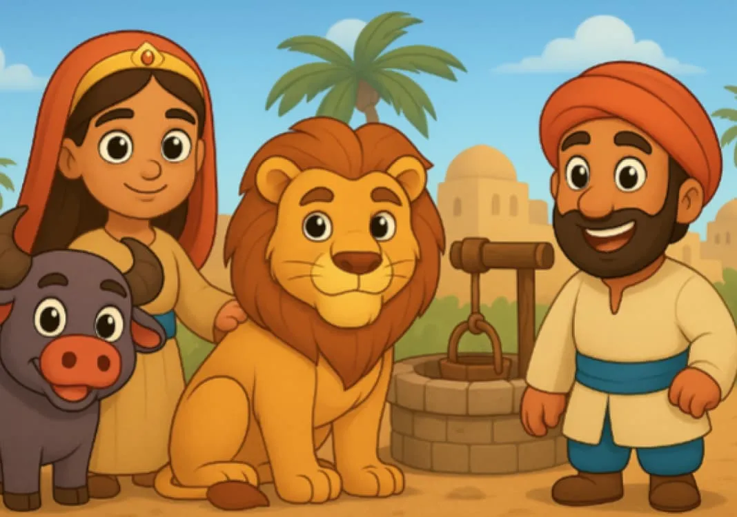 At last, they reached the well. It was almost buried, and a fallen palm tree lay across its stones. But that was not all. From the storm’s dust emerged a lion with a golden mane, like fire. The villagers shrank back, whispering: