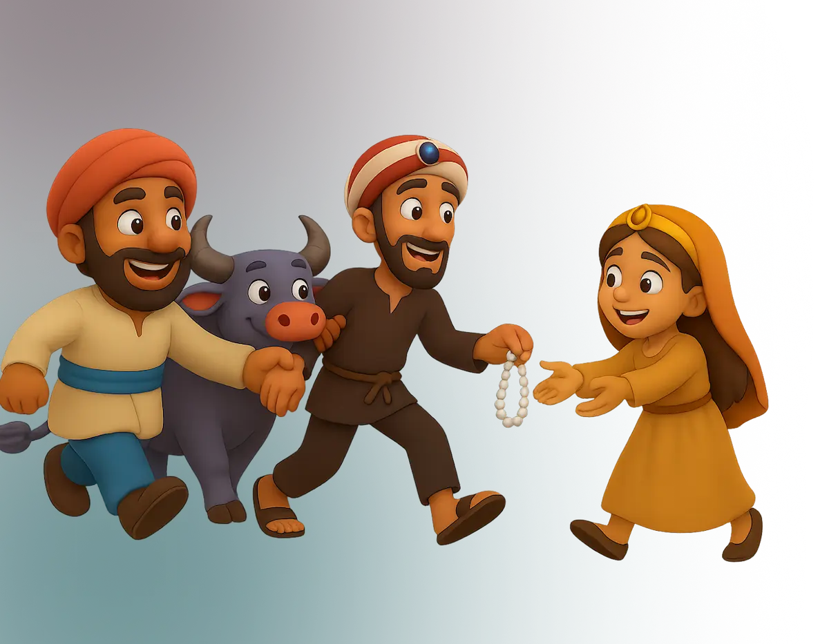 One day, while walking through the crowded market, she suddenly realized her pearl necklace was gone. Looking around, she spotted a man hurrying away with it in his hand.